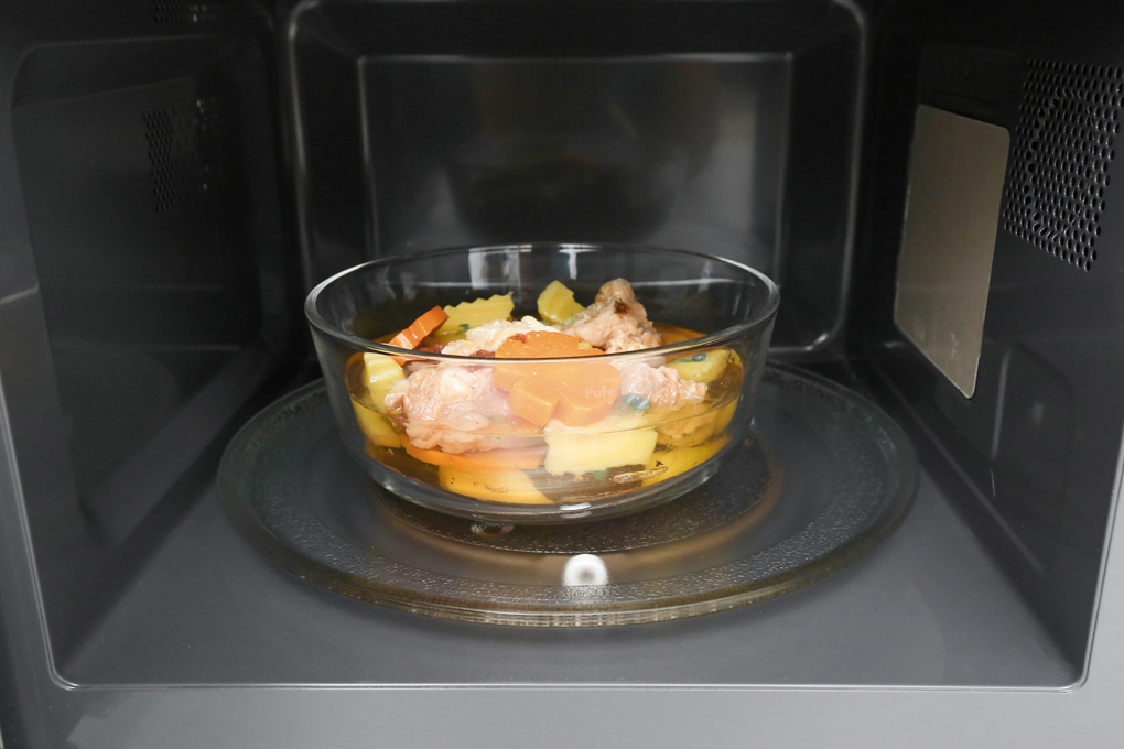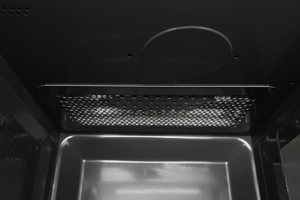 Khoang lò vi sóng bằng thép không gỉ bền bỉ, hạn chế han gỉ, dễ vệ sinh sau khi dùng. Khoang lò rộng rãi có thể hâm được 1 tô canh lớn
