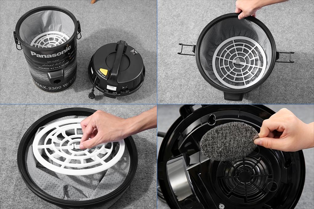 Máy hút bụi Panasonic với thiết kế công nghiệp, kiểu dáng chắc chắn, mạnh mẽ, có với bánh xe tiện di chuyển nhẹ nhàng