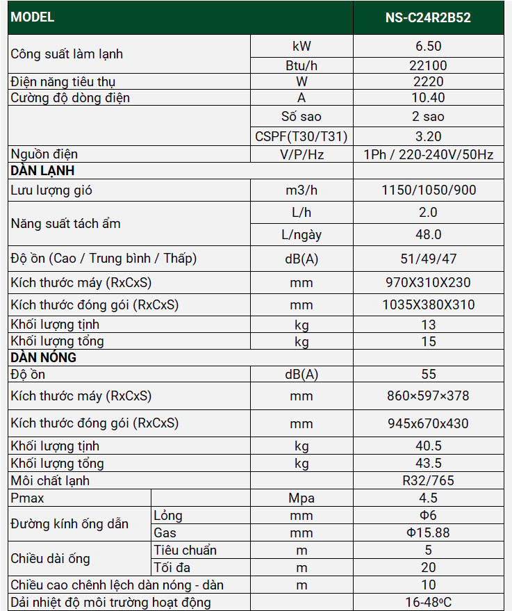 Với những tính năng thông minh và hiệu suất làm mát vượt trội, NS-C24R2B52 là lựa chọn lý tưởng cho không gian rộng, mang đến trải nghiệm thoải mái, tiết kiệm và bền bỉ theo thời gian.