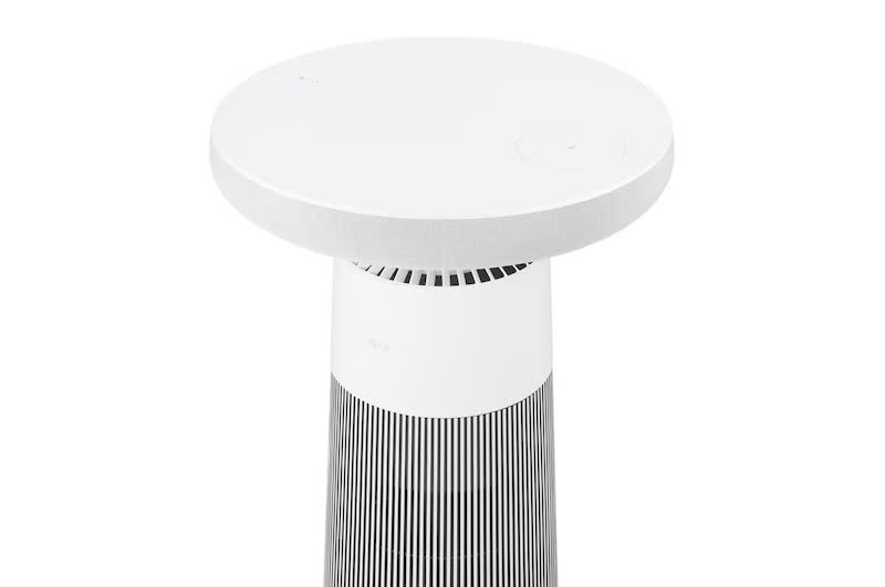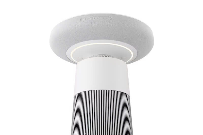 Hình ảnh loa LG Aerospeaker trong phòng, cung cấp 4 chức năng trong 1: loa, lọc không khí, đèn chiếu sáng theo tâm trạng, sạc không dây.