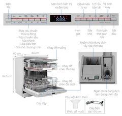 - Máy rửa chén có công suất hoạt động 2400W và tiêu thụ lượng nước sử dụng cho mỗi lần rửa là khoảng 9.5 lít, có thể rửa được 14 bộ châu Âu (tương đương 3 - 4 bữa ăn).