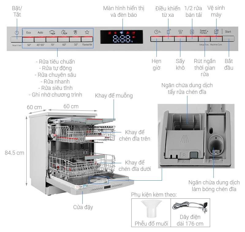 - Công nghệ rửa bằng nước nóng: Sử dụng nước nóng đến 70°C để rửa chén bát, giúp diệt khuẩn và loại bỏ mùi hôi từ thức ăn bám trên đồ dùng hiệu quả.
