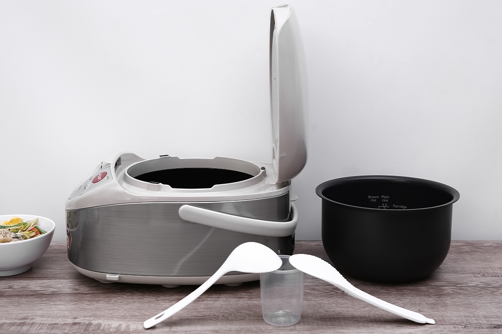 Đi kèm nhiều phụ kiện tiện ích: muỗng cơm, muỗng canh và cốc đong giúp dễ dàng đo lượng gạo cần nấu