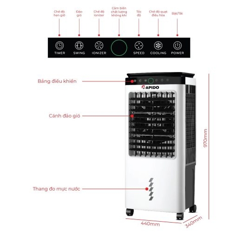 Quạt điều hòa không khí Rapido Everest 6000-D được sản xuất tại Việt Nam trên dây chuyền hiện đại của Đức. Với thiết kế hiện đại, kiểu dáng sang trọng, chức năng vượt trội, độ bền cao mang lại sự tiện nghi cho gia đình. Ngoài ra, khi mua quạt điều hòa không khí Rapido Everest 6000-D khách hàng được tặng thêm 02 hộp đá khô, hỗ trợ tối đa việc làm mát nhanh và sâu.