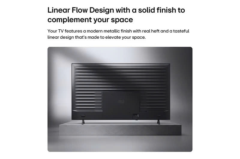 Tivi LG 98NU855BPSB có thiết kế tối giản với viền mỏng tinh tế, giúp mở rộng không gian hiển thị. Kích thước lớn 98 inch tạo điểm nhấn ấn tượng cho phòng khách rộng, phòng họp hoặc không gian giải trí cao cấp. Chân đế chắc chắn với lõi kim loại đảm bảo độ ổn định khi đặt bàn hoặc treo tường.