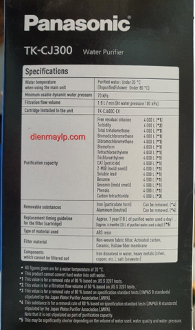 - Lưu lượng lọc được của thiết bị lọc nước không điện Panasonic là 1.8 lít/phút (trong điều kiện áp suất nước 100 kPa) giúp đảm bảo nguồn nước sạch luôn sẵn có cho gia đình sử dụng.